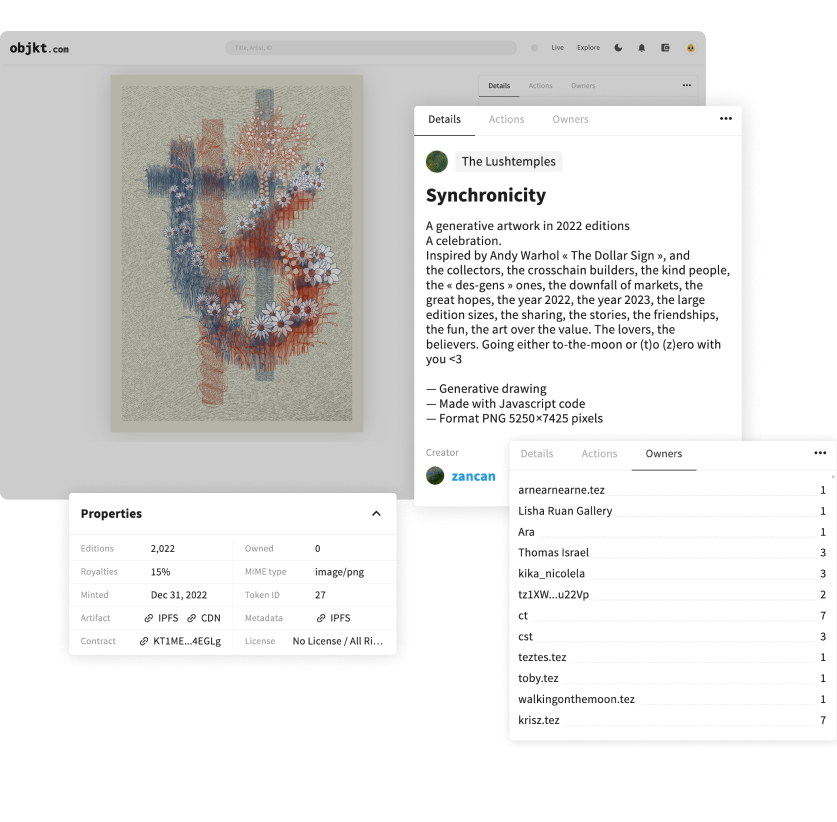 It can be pretty easy to distinguish music from poetry, or generative art from photography, but specific attributes of the NFT are located in the cataloging, which on Objkt.com is to the right of the illustration. This includes information about the collection, and charitable projects or licensing rights that might be transferred to the collector or reserved by the creator. You can also see the provenance and collector base for the artwork. By clicking on ‘Owners’ you can see who has collected the artwork or other editions in the past, and who are the current holders of the artwork or collection. Over time, you’ll likely see that you and a similar set of collectors gravitate towards the same NFTs, and it’s not uncommon for those collectors to start communicating directly to highlight new projects or even trade amongst themselves.