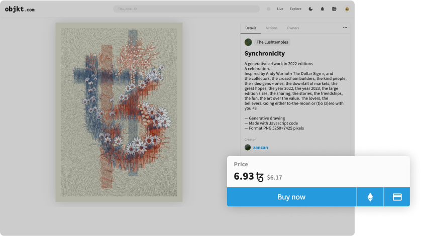 Once you have chosen and understood the attributes of an NFT in which you’re interested, it’s very easy to either purchase an NFT or make an offer. Click on the artwork and if the work is available for sale, click 'buy now' and you’ll be able to purchase the NFT using tez or credit card. Alternatively, you can click on the ‘Actions’ bar and make an offer to the creator(s). Keep in mind that sometimes artworks have more than one creator or the artwork might offer royalties to a gallery, curator, advisor or charity. These are clearly outlined in the cataloging and might influence the price you’re willing to pay for a work.